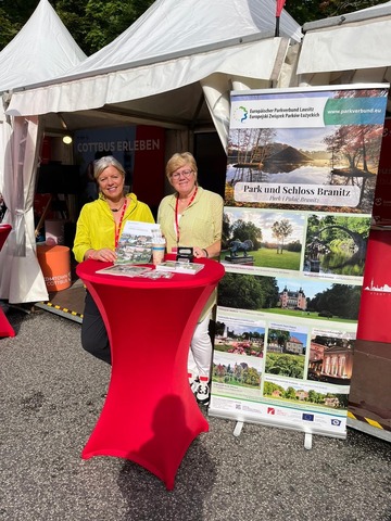 Mit Informationsmaterial und kleinen Geschenken hat am ersten Septemberwochenende der Europäische Parkverbund Lausitz auf dem Brandenburg-Tag in Finsterwalde für sich und damit für neun Verbundpartner geworben. In Partnerschaft mit dem Stand der Boomtown Cottbus übernahmen Claudia Fröhner und Gabriele Grube (Foto von links) die Ansprache der Festgäste und interessierten sie vor allem für die kleineren Parkanlagen in Brandenburg, Sachsen und Polen, die als Geheimtipp für viele noch zu entdecken sind. Es gab viele Interesse und Nachfrage, gerade mit Blick auf die Ausflugssaison in den bevorstehenden farbenfrohen Herbsttage.